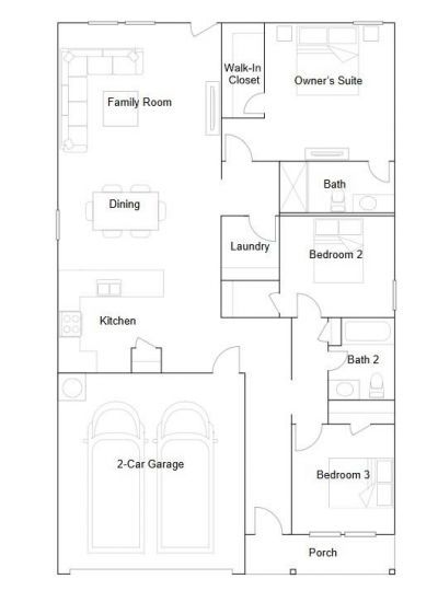 The NEWLIN floor plan showcases a spacious open floorplan shared between the kitchen, dining area and family room for easy entertaining. An owner's suite enjoys a private location in a rear corner of the home, complemented by an en-suite bathroom and walk-in closet. There are two secondary bedrooms at the front of the home, which are comfortable spaces for household members and overnight guests. Prices and features may vary and are subject to change. Photos are for illustrative purposes only.