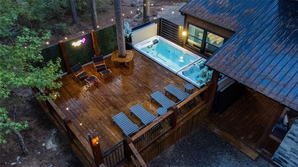 INVESTORS TURNKEY DREAM | TOP 5% AIRBNB | $164,535.60 GROSS 2025. FUTURE BOOKINGS CONVEY TO THE BUYER. Chocolate Fudge is a fully operational, high-performing luxury short-term rental located in the heart of Hochatown, with a three-year proven track record of repeat guests. From the moment guests arrive, the modern exterior design sets the tone with clean architectural lines and modern design. Within, soaring ceilings and floor-to-ceiling windows flood the open-concept living space with natural light, framing the towering pines that surround the property on every side. A dramatic stone-to-ceiling fireplace anchors the living room, with stained cement flooring and stained wood walls accented by painted cabinetry to create a cohesive, designer aesthetic. The kitchen is fully equipped with stone countertops, stainless steel appliances, and painted accent cabinets that complement the warm tones of the stained wood walls. A dedicated dining space with additional island seating, ideal for large groups. The two king master suites each deliver a spa-level retreat with dual vanities, a soaker bathtub, and a walk-in shower with dual shower heads. Upstairs, a bunk loft with full bath, provides additional sleeping capacity alongside a dedicated game area featuring air hockey, foosball, shuffleboard, and arcade game. This cabin sleeps 10+ guests in comfort and style. The outdoor living experience is where Chocolate Fudge truly separates itself from the competition. A 21-ft all-season swim spa -combining a 13-ft jetted pool with an 8x8 ft, 65-jet hot tub-anchors a large swim deck designed for entertaining. A covered outdoor patio with gas fireplace and Smart TV extends the living space into the pines. A firepit with swings, a custom playset, a propane grill, and string lighting across 1,100 sq. ft. of deck create an outdoor environment that guests return to again and again. EV charging outlet (220V) installed.